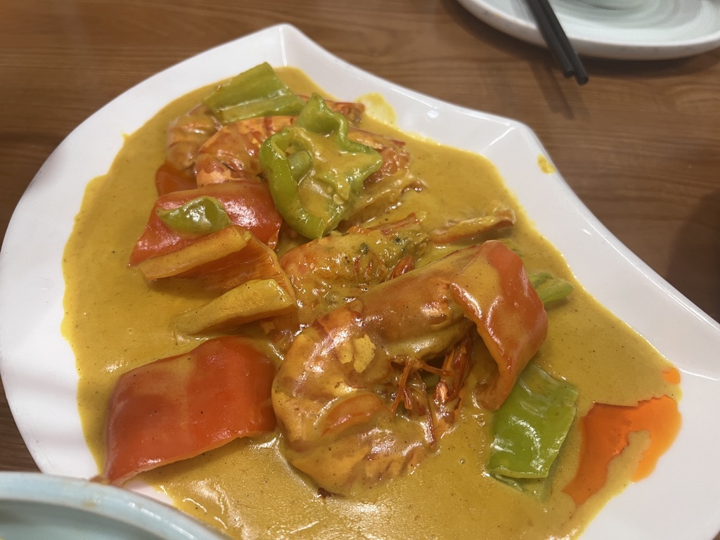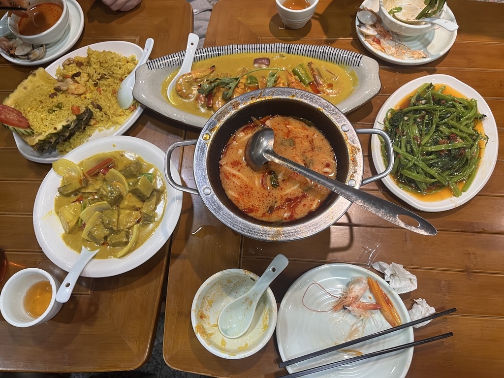 冬阴功比在泰国本地的吃的差一点,但也是非常不错的水准。爆炒空心菜很绝,细嫩的空心菜,入口配合着牙齿的咀嚼,越嚼越香。咖喱皇炒虾,虾头只保留黄的部分,配合咖喱,夹起一只从头部那么一吸,舌头起舞,嘴唇蹦迪。再来上一口紧实的虾肉🦐,来来来!刷我滴卡,萨瓦迪卡~🙏。