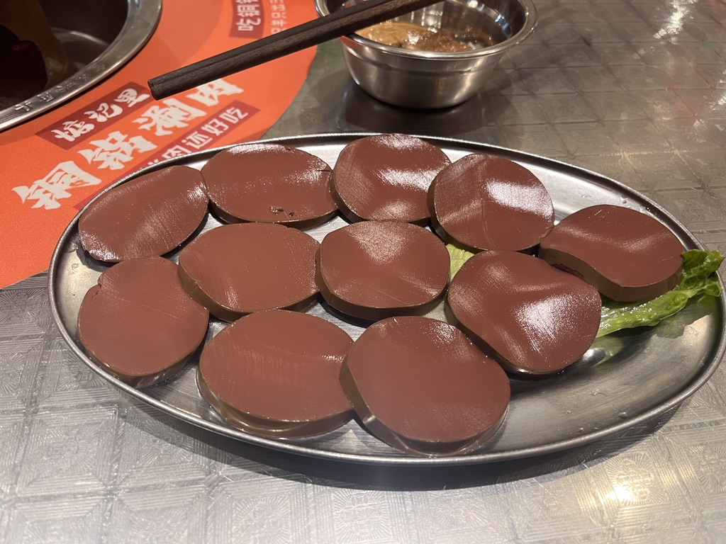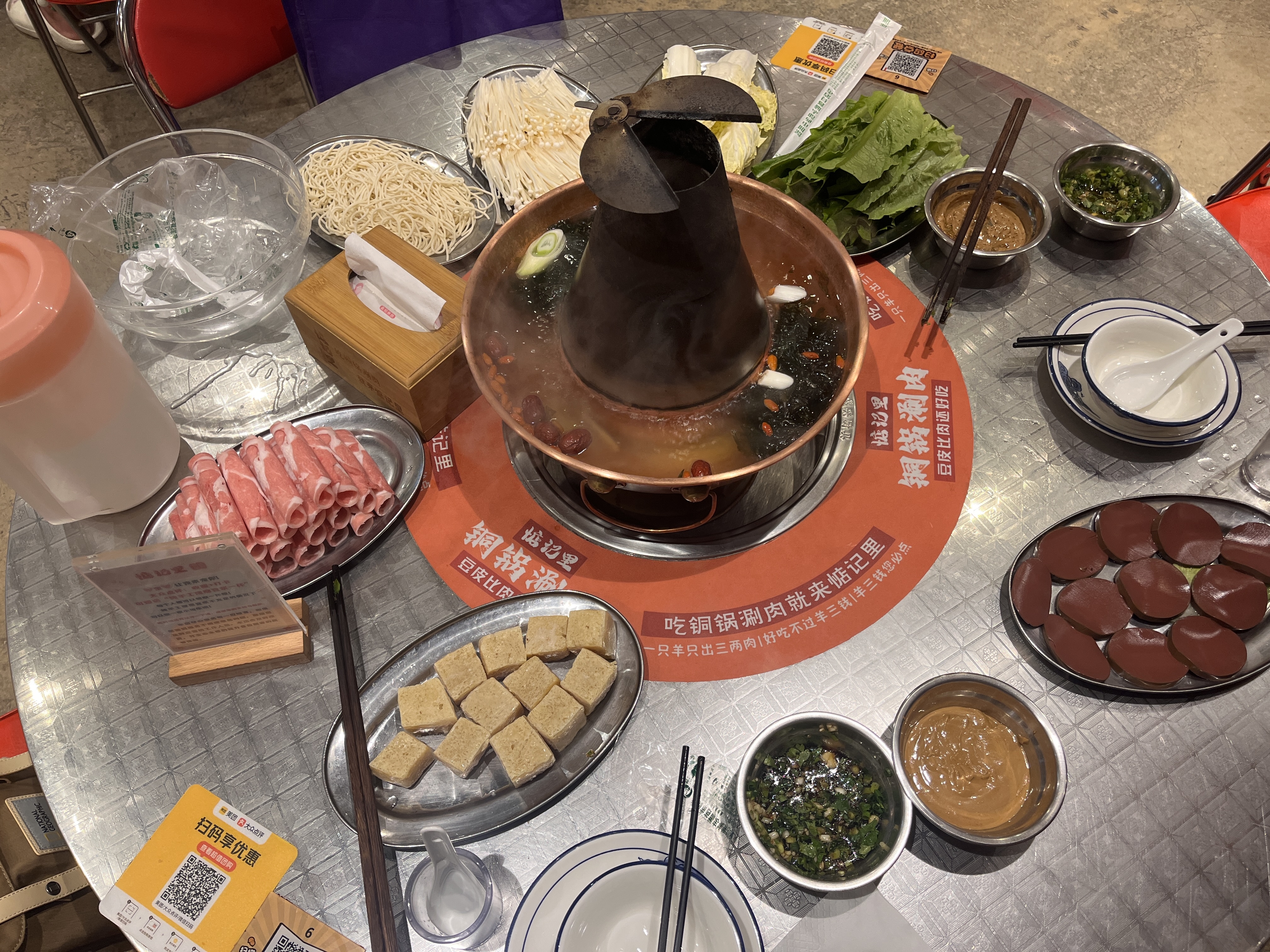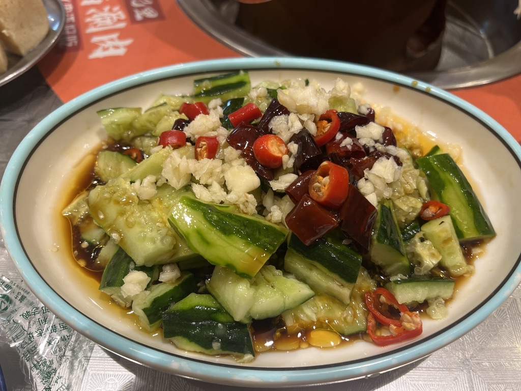 买了一个双人餐:🍲清汤锅底、包含半斤🐮肥牛、半斤🐑羊肉卷、一份鸭血、冻豆腐、油麦菜🥬、金针菇、一份手工面。大众点评给 5 星,送一份菜,我果断要了拍黄瓜🥒,他家的拍黄瓜真的是一绝,必点!!!