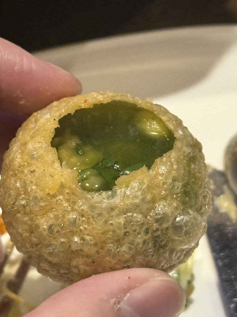 脆球:出于好奇可以点点,点完后应该不会再点了。脆球里面是土豆泥🥔,搭配的汁水是用薄荷和马沙拉等香料做的。味道👅很神奇,说不上来的怪味道,我与另外一个同事接受不了,出于不浪费的原则硬把脆球吃了,与我无缘👋。