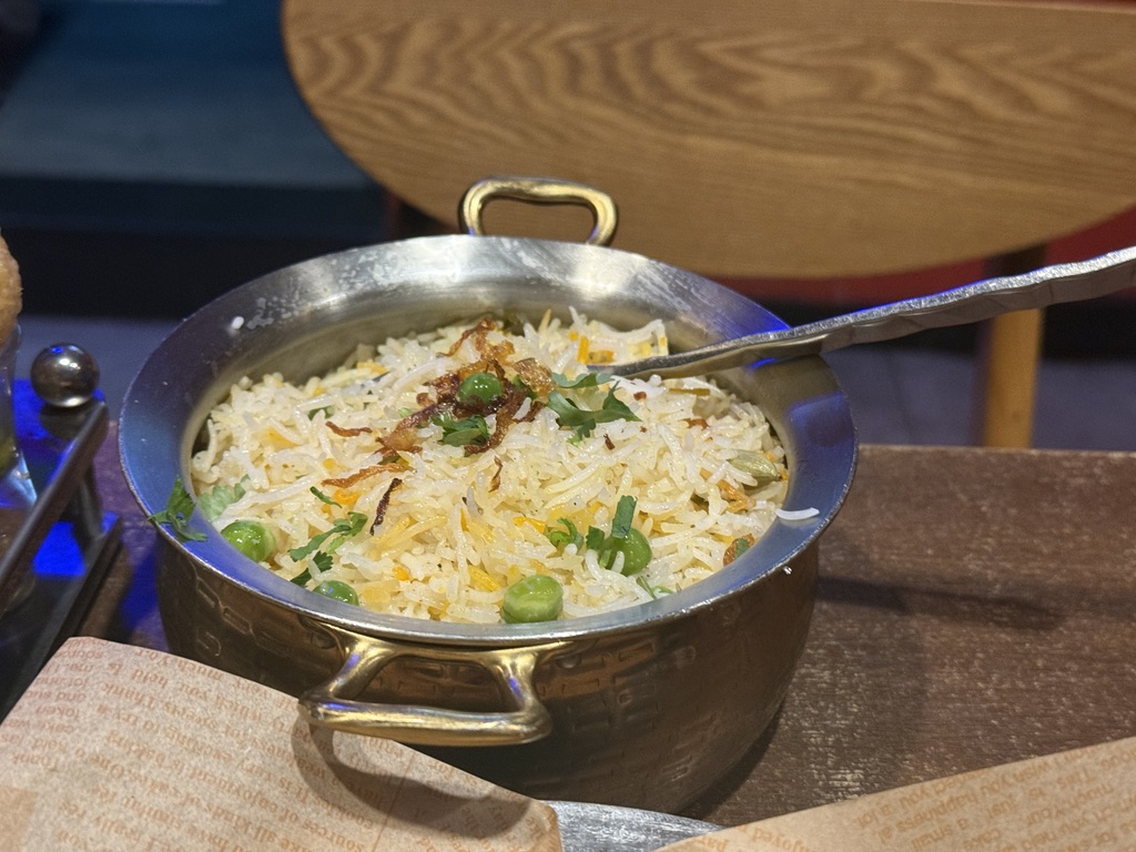 青豆炒饭:炒饭个人比较喜欢😍。印度的大米和青豆煮的,米粒很分明口感不错😌,白口吃也有点味道。也是配合着 布拉羊肉咖喱🐑 和 黄油咖喱鸡🍛 一起吃,因为咖喱🍛配的一般,所以整体就只有还好的水准。